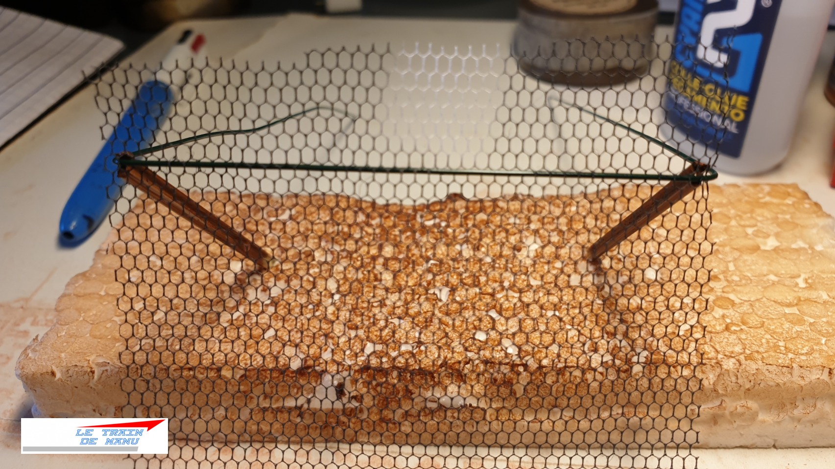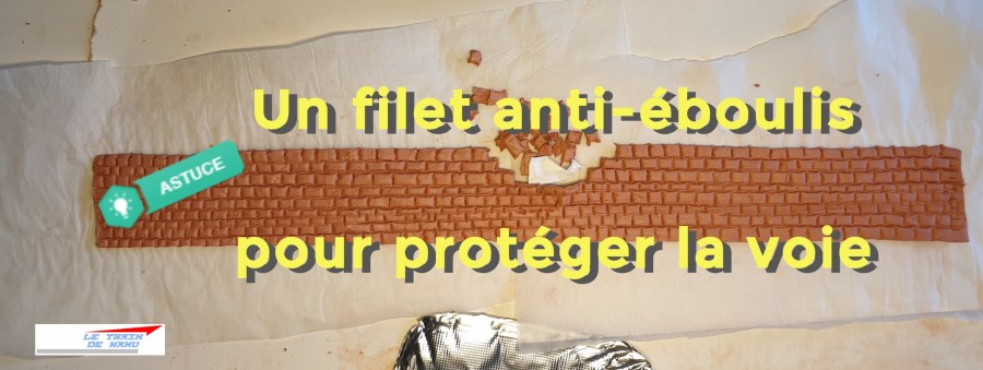 Un fil de fer 2mm, initialement prévu pour l’art floral et censé représenter un câble métallique, est coupé pour obtenir un morceau d’une trentaine de centimètres. Le tulle y est accroché puis le fil de fer est plié en forme de U dont la largeur correspond à la taille du tulle. Ce U est ensuite posé en biais dans le talus et repose sur les extrémités supérieures des rails. Le tout est collé à la Colle 21 cyanoacrylate. C’est robuste.