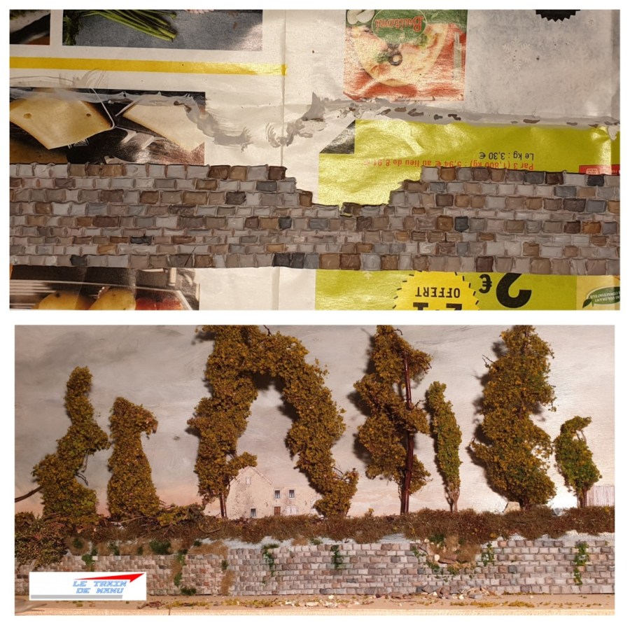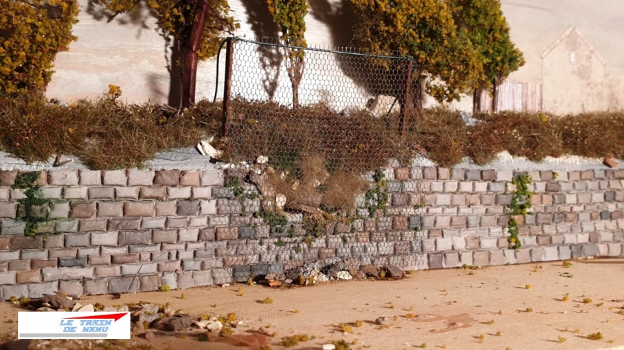 Une première section de mon mur de soutènement est en place et je poursuis sa construction avec une nouvelle tranche de 60 centimètres. Pour diversifier le décor, je vais évoquer un éboulement partiel de cet ouvrage d’art et la protection grillagée mise en place par les équipes « Voie et Bâtiments » de la compagnie.