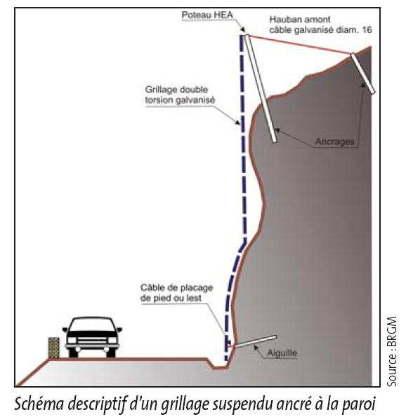 Face aux risques naturels majeurs d’effondrements rocheux, il existe de nombreuses parades passives. Leur résistance est bien évidemment fonction de la quantité de roches susceptible de chuter. Il n’est pas question ici de toutes les citer et je n’évoquerai ici que le grillage pendu dont la vocation est de canaliser en pied versant les chutes fréquentes de morceaux de roches de faible volume. Je me suis inspiré d’un schéma publié par l’Observatoire Régional des Risques Majeurs de la Région PACA. La photo 1439 ci-dessus en est extraite.