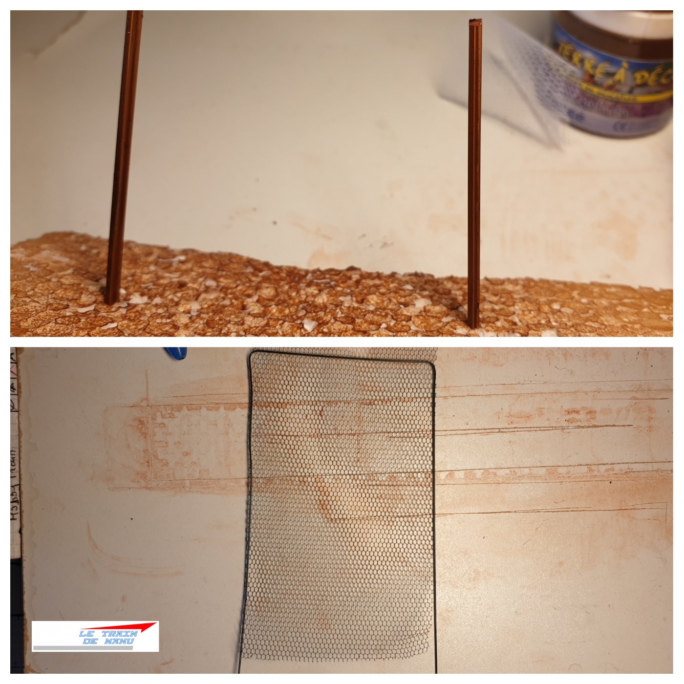 Je récupère un coupon de rail Jouef de ma boite à rebuts. Le rail est désolidarisé des traverses et coupé en deux sections d’une dizaine de centimètres avec un disque à tronçonner monté sur la Dremel. Ces deux bouts de rails sont peints en brun cacao avec une bombe de peinture de bricolage. Après séchage, j’effectue une passe de vernis mat en bombe. Ce vernis va permettre l’accroche des terres à décor.