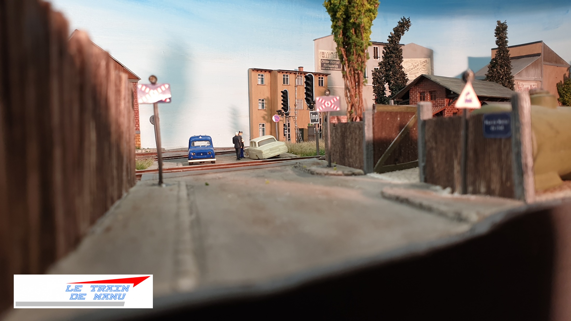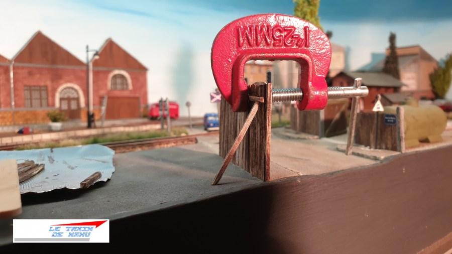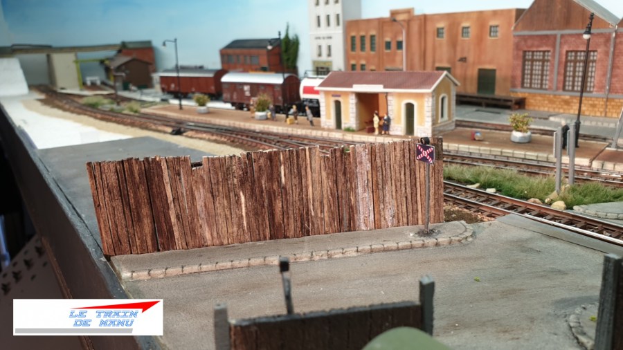 je souhaitais une clôture arrière qui ne soit pas occultante pour ne pas masquer le quai. La clôture arrière est un simple tulle de robe de mariée, peint en vert et collé à la colle cyanoacrylate sur trois allumettes. J’avais déjà utilisé ce tulle pour le portail de l’entreprise STPM.