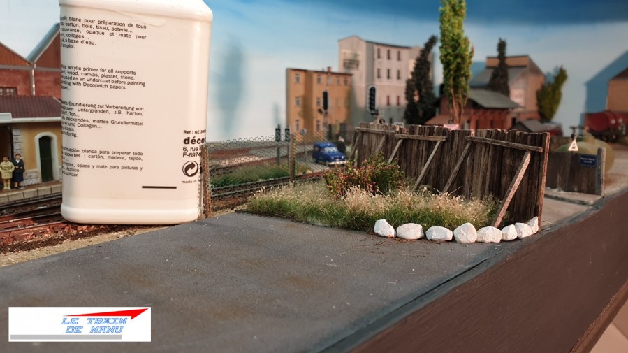 Dans un tapis d’herbes MBR 55-0013, je déchire de petits morceaux. Après les avoir encollés avec de la colle vinylique pure, je les applique sur la terre en veillant à bien en disposer tout autour des étais de la palissade. J’incorpore quelques buissons MBR 50-5007 que j’avais déjà disposé près de ma première cabine d’aiguillage.