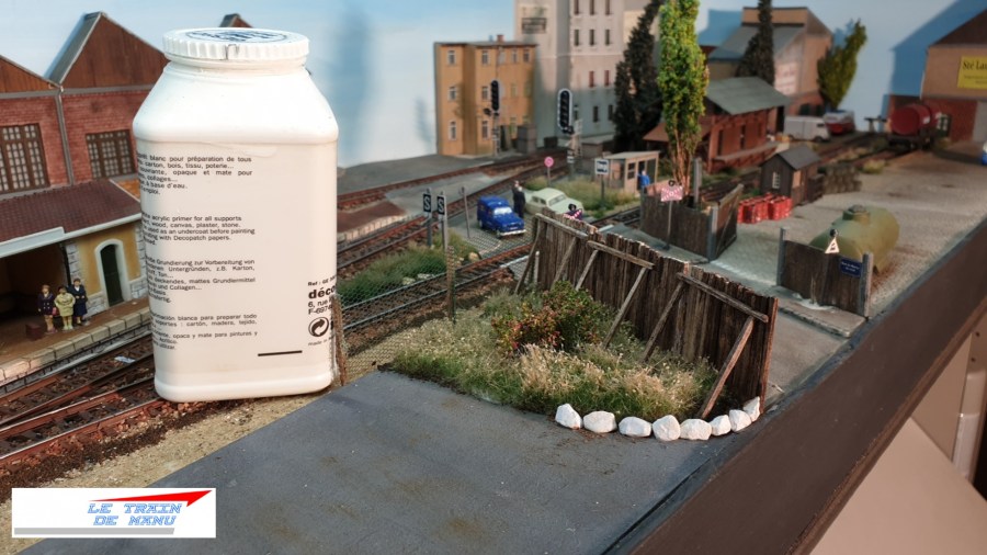 Depuis plusieurs mois, je réfléchissais à l’aménagement du premier plan de la ZI Nord en ayant la contrainte majeure de la hauteur, avec deux enjeux : un aspect logistique en évitant tout décor susceptible de gêner les mouvements voire d’être cassé lors de futures manipulations. Ensuite un aspect visuel avec un bâtiment trop haut qui masquerait le second plan, dont l’abri de quai. J’ai donc décidé d’implanter une caserne de pompiers sur la base d’un simple petit hangar » fait maison « . Commençons par préparer le terrain.
