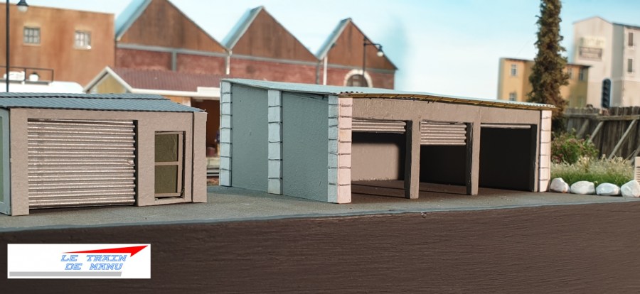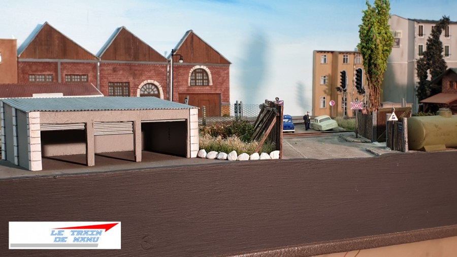 Je fais de même pour les rideaux métalliques dont la hauteur d’ouverture est calculée par rapport aux futurs véhicules afin de varier le visuel. Si un rideau est posé maladroitement légèrement en biais, pas de panique : dans la réalité aussi, certains rideaux sont parfois un peu de travers. Une gouttière d’un ancien kit ABE a été posée.