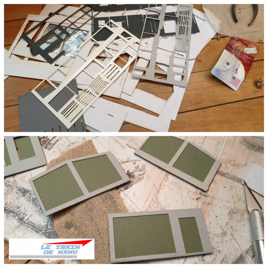Les murs pignons sont taillés dans des chutes vertes de mon Hôtel du Nord. Les façades et les armatures en béton sont issues de chutes de grappes de mes cabines d’aiguillage. Ces dernières ont un atout majeur : leur verso est autocollant, ce qui est particulièrement pratique pour réaliser le cadre de la porte d’entrée. les autres pièces sont collées à la colle blanche déposée au pinceau fin.