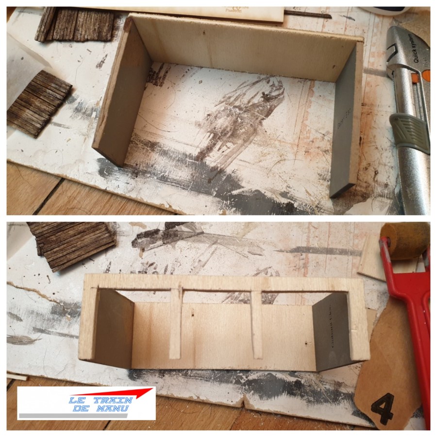 Les murs latéraux sont en MDF de 3mm, issus d’une chute de ma remise à locomotives Cités miniatures (en cours de construction elle aussi). La longueur du mur (donc la profondeur du bâtiment) est de 7 cm. Avec la scie à chantourner, je découpe un toit légèrement en pente : 45 mm au fond et 40 mm en façade.