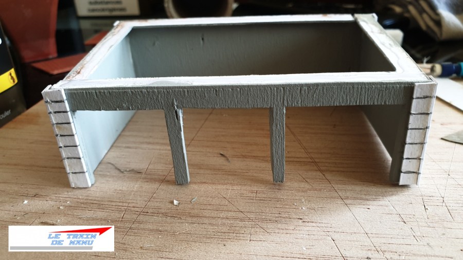Les pierres d’angle sont simplement découpées dans une chute de carton issue de mon Hôtel du Nord de chez Architecture & Passion. Il faut juste faire attention pour que les tranches soient blanches. Les pierres sont simplement tracées avec le dos d’une lame de cutter et foncées avec un coup de crayon à papier.