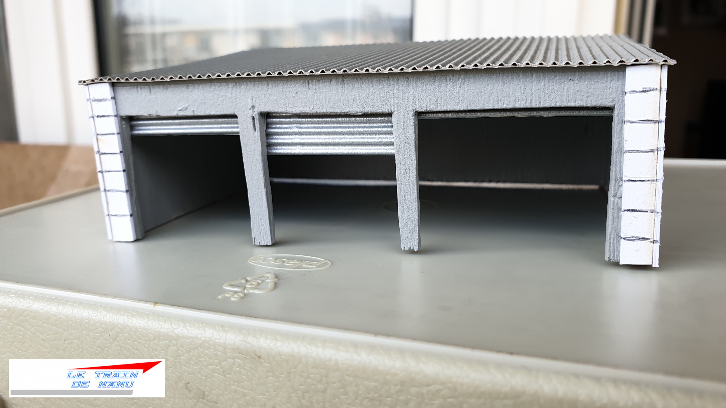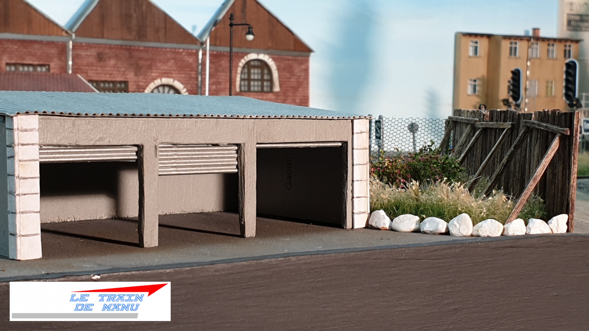 Je fais de même pour les rideaux métalliques dont la hauteur d’ouverture est calculée par rapport aux futurs véhicules afin de varier le visuel. Si un rideau est posé maladroitement légèrement en biais, pas de panique : dans la réalité aussi, certains rideaux sont parfois un peu de travers. Une gouttière d’un ancien kit ABE a été posée.