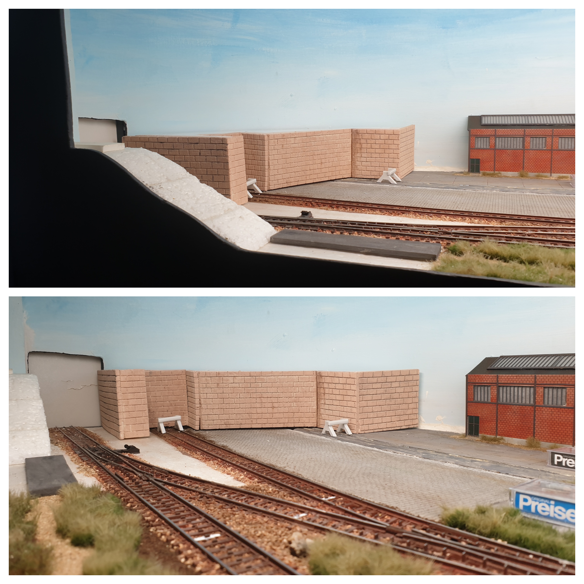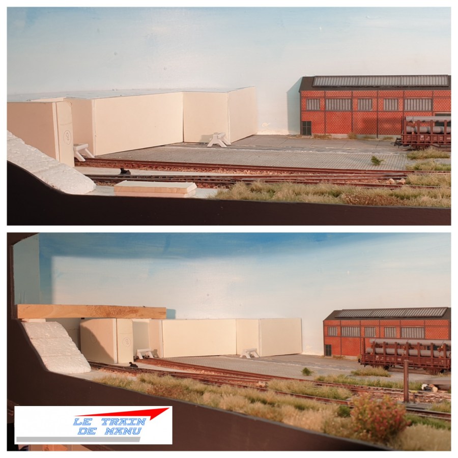 Confinement oblige, il va falloir travailler avec des produits en stock, c’est à dire pas grand chose. Il faut de plus opter pour des matériaux faciles à travailler puisque d’une part le fond de décor est arrondi et d’autre part la façade du remblais, côté ZI, doit prendre en compte la présence des embranchements et des heurtoirs.