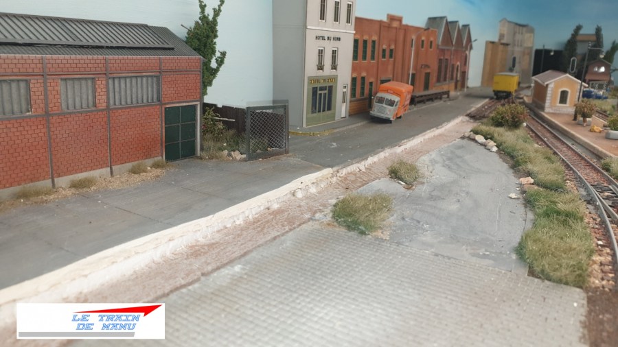 La nouvelle voie de la STPM vient d’être posée et câblée. Je termine son intégration en rebouchant la dalle béton de part et d’autre des rails. A cette fin, je commence par combler les trous entre la nouvelle voie et la dalle en place avec des chutes de carton-mousse collées à la colle vinylique. Puis je découpe des bandes de 9 mm de large dans du carton de 1 mm d’épaisseur. Elles sont collées à la Colle21 cyanoacrylate sur les extrémités des traverses, le long de la face externe des rails. Je fais de même sur le passage à niveau qui donne accès à la cour intérieure. Enfin, j’étale de l’enduit de rebouchage en tube sur ces bandes. Une fois sec, l’enduit est poncé au papier de verre à grains fins puis peint à la peinture acrylique gris béton (50% blanc + 25% noir + 25% ocre claire).