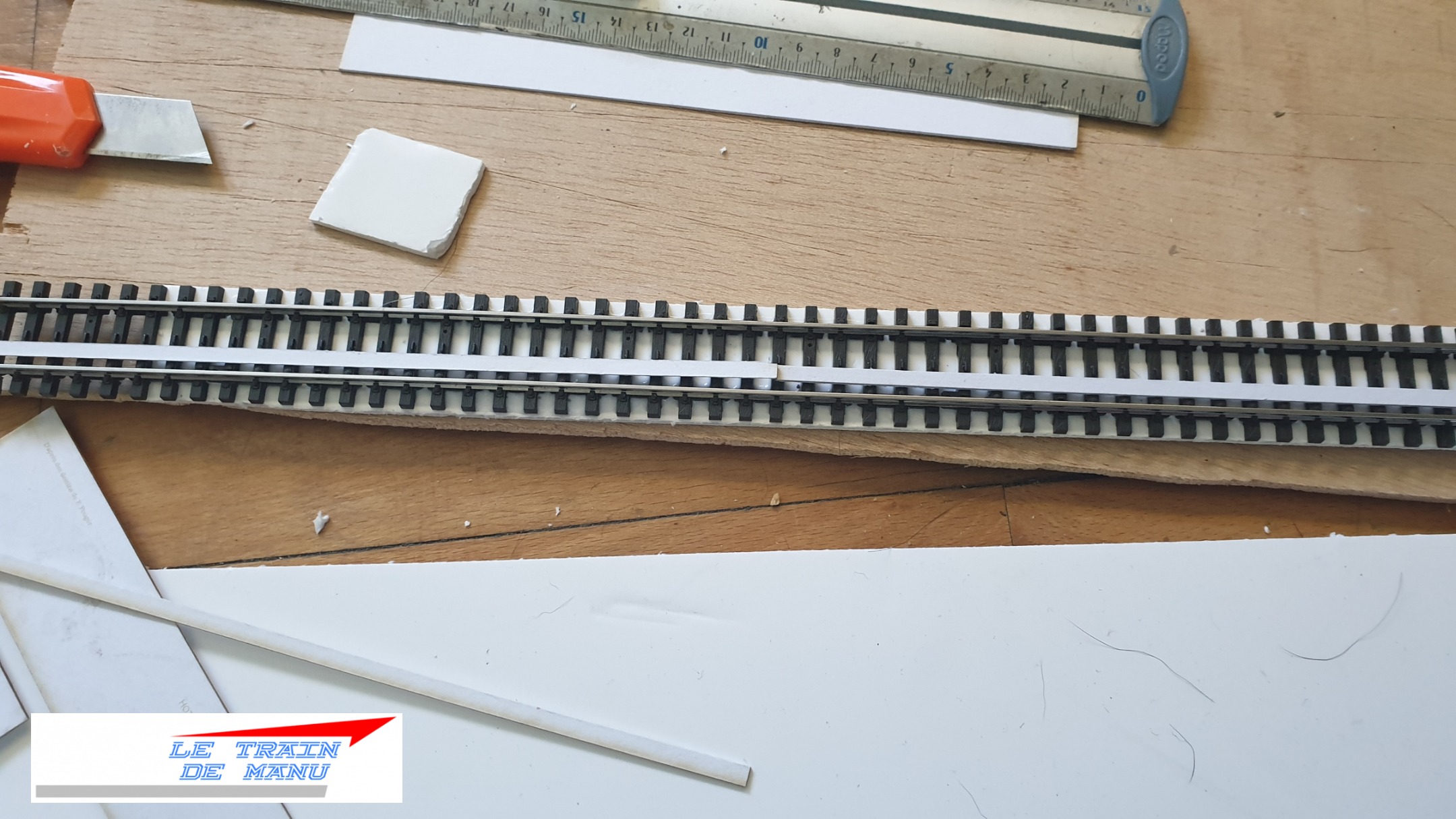 Dans du carton-mousse de 3 mm, je découpe deux bandes de 50 cm de long sur la largeur de la voie. Le carton-mousse n’est pas pelé. Les bandes sont collées à la colle vinylique pure l’une sur l’autre, puis sous la voie. On met sous presse avec des grosses boites de conserve.