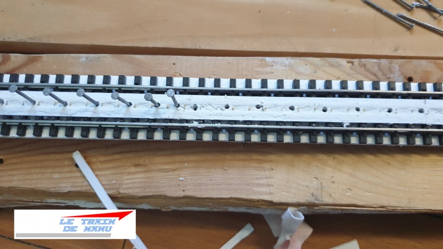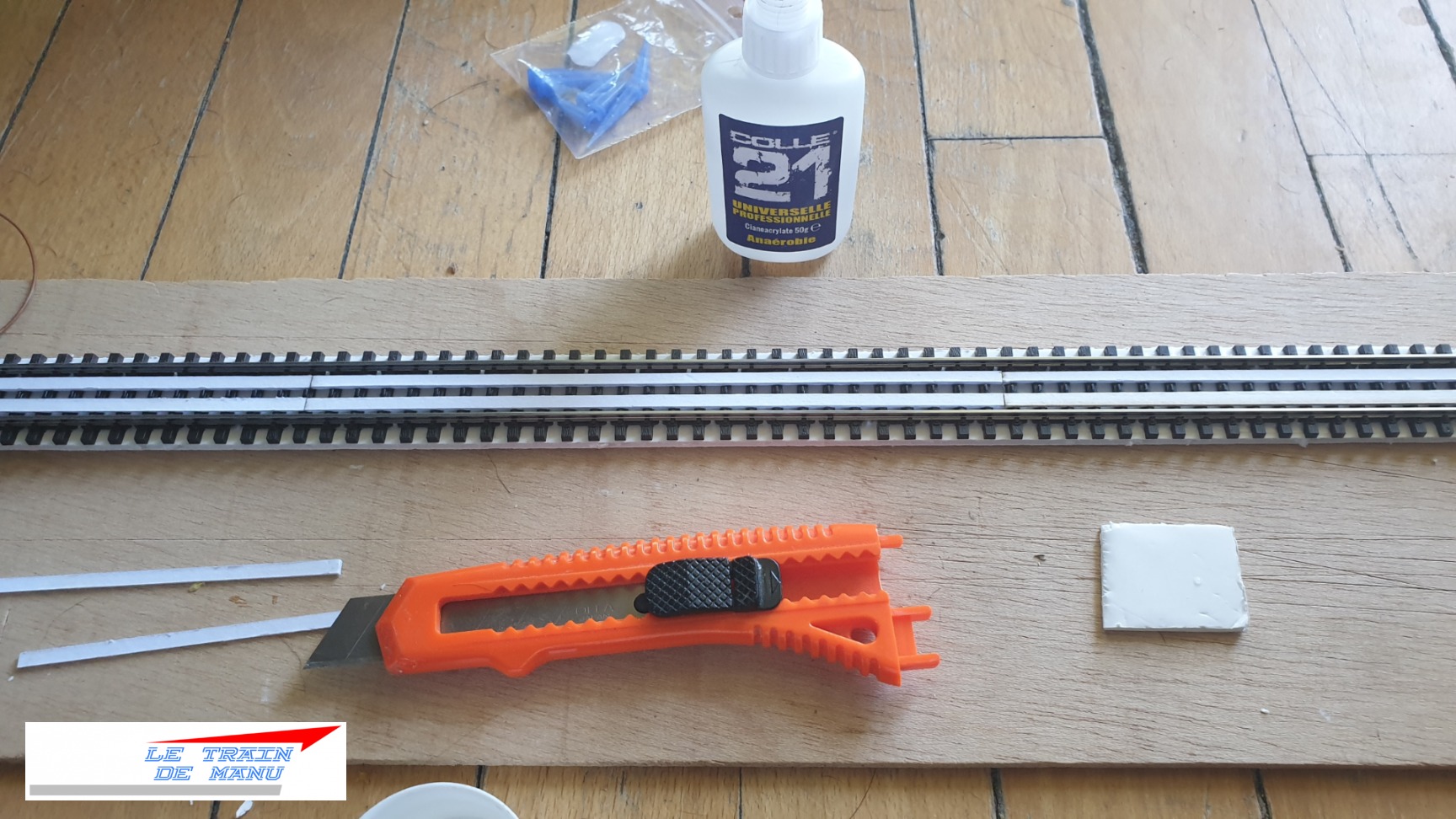 Dans du carton de 1 mm d’épaisseur, je découpe des bandes de 4 mm de large, largeur entre les picots centraux et les tirefonds. On vérifie qu’un wagon passe sans encombre. Les bandes sont ensuite collées à la Colle 21 cyanoacrylate : une petite goutte déposée avec la canule de la marque sur chaque traverse, de part et d’autre des picots centraux, sur une longueur de 50 cm.