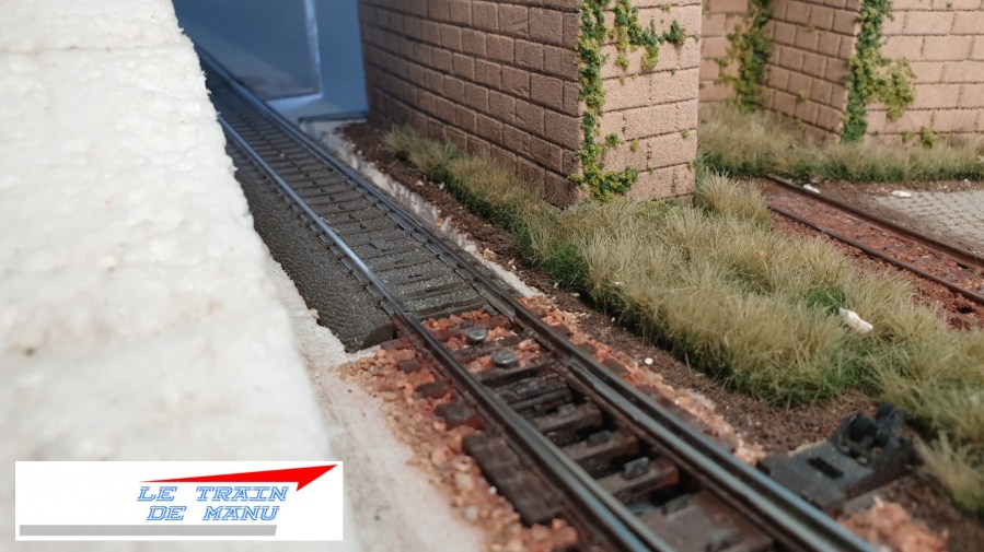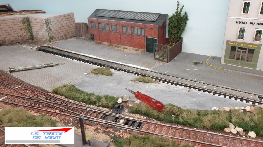 Épisode 223 – L’embranchement de la STPM est une longue voie partiellement noyée dans un sol en béton. Cette section noyée n’est ni fiable électriquement ni esthétique. Je décide de la refaire en totalité et profite de cette occasion pour installer un dételeur. Des clous seront utilisés pour le rail central.