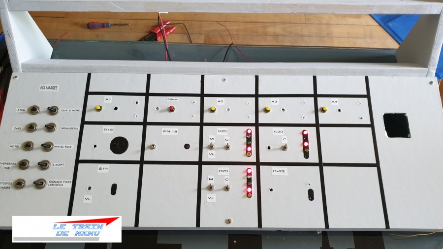 Photo 1742 : Électricité du réseau. Câblage du nouveau tableau de commande. Les différents inverseurs et voyants de contrôle des signaux. Source : letraindemanu.fr
