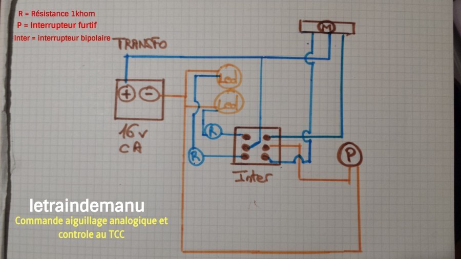 ● alimenter et commander les aiguillages à solénoïde : 14v courant alternatif (AC). Ces câblages seront connectés à la sortie « accessoires » d’un transformateur Fleischmann. Chaque aiguillage doit être commandé par un bouton poussoir associé à un inverseur ( On / On ) multipolaire (plusieurs circuits électriques) pour agir aussi sur la signalisation.