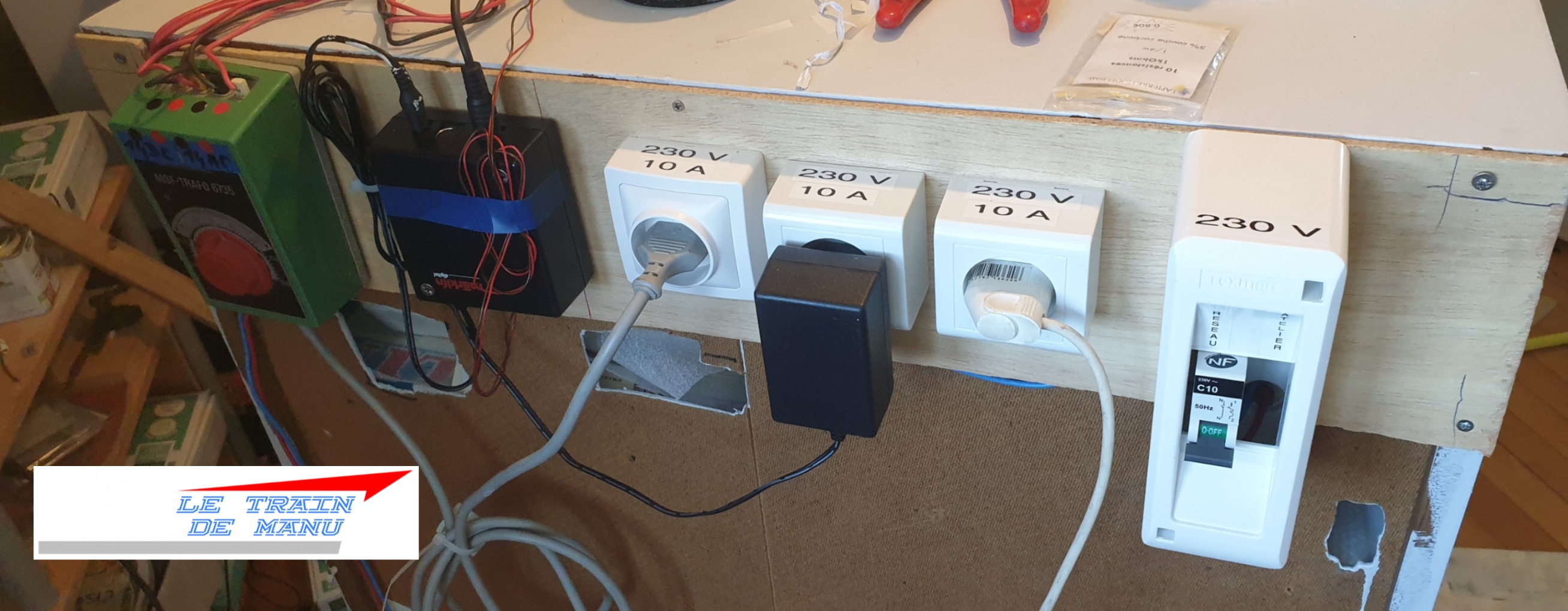 ● un disjoncteur 10 A pour le réseau : alimenté par du câble de 2,5 mm², il distribue une prise alimentée en permanence pour l’éclairage des modules, une prise alimentée par interrupteur encastré dans le pupitre pour la centrale digitale et un troisième également avec interrupteur pour le transfo accessoires. Tous ces branchements sont en câbles de 2,5 mm². (Bleu = neutre et Rouge = phase, pas de câble de terre puisque les prises des transformateurs n’en sont pas dotés).