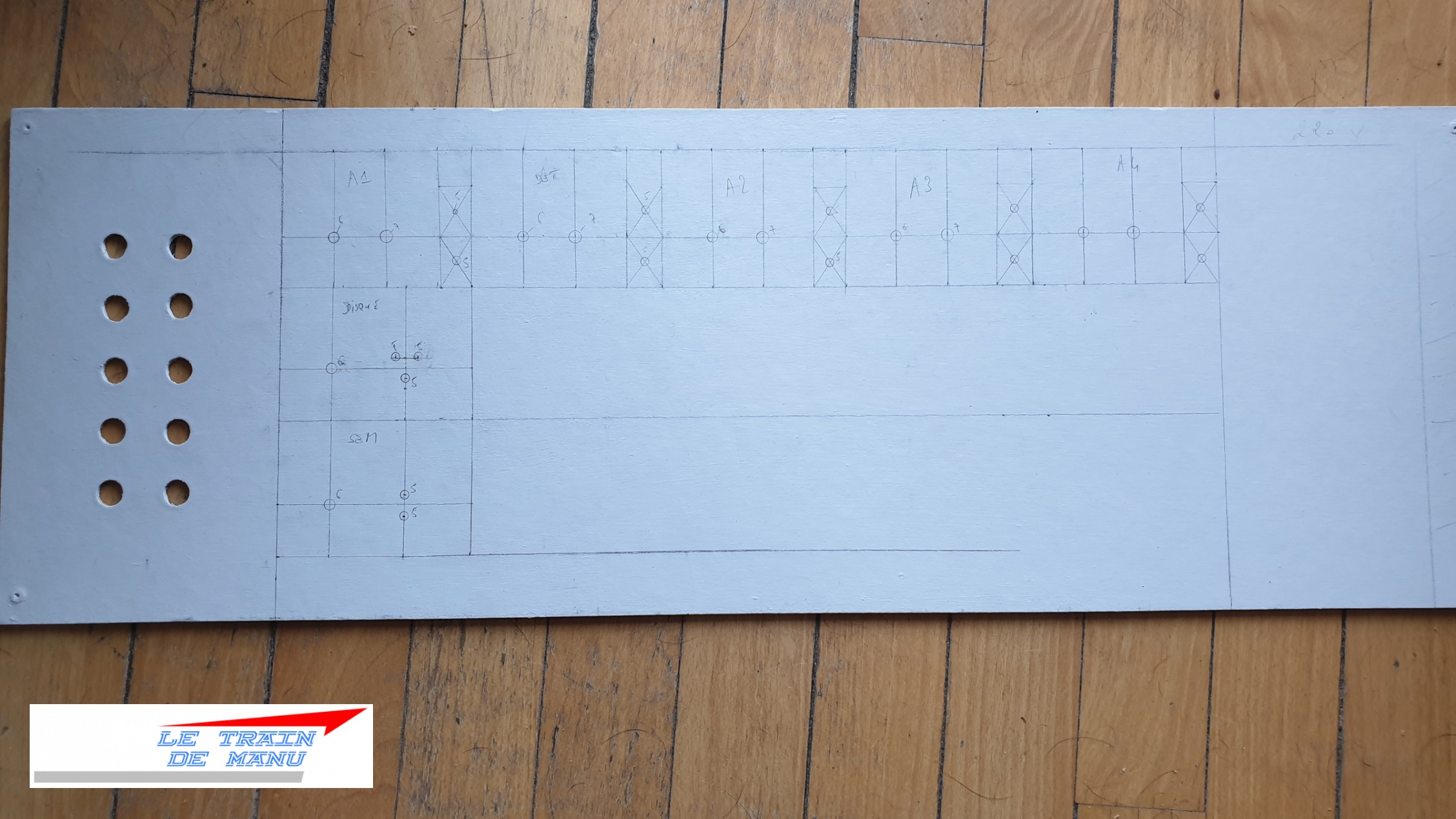 La façade supérieure du tableau est en MDF 3mm (fond d’armoire), peint et verni a raison de plusieurs couches alternées. La plupart des commutateurs sont repérés en façade avec une étiqueteuse type Dymo™. Les trous ont déjà été percés, mais la peinture les a en partie rebouchés. Il faut donc les refaire à l’aide des pointes de 3 et 5mm. Tous les orifices sont repérés au verso puisque on travaille en « négatif ».