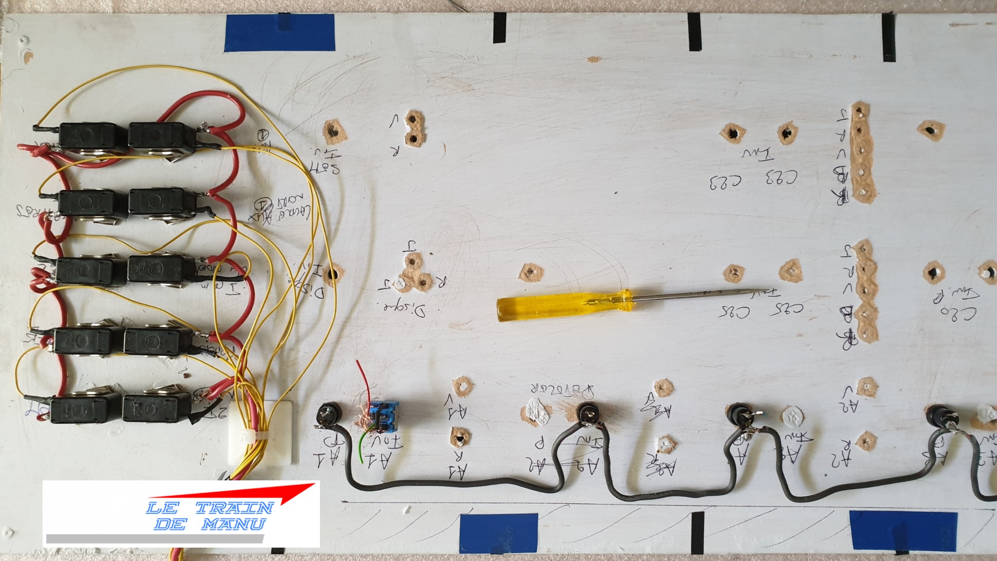 Photo 1739 : Électricité du réseau. Câblage du nouveau tableau de commande. Source : letraindemanu.fr