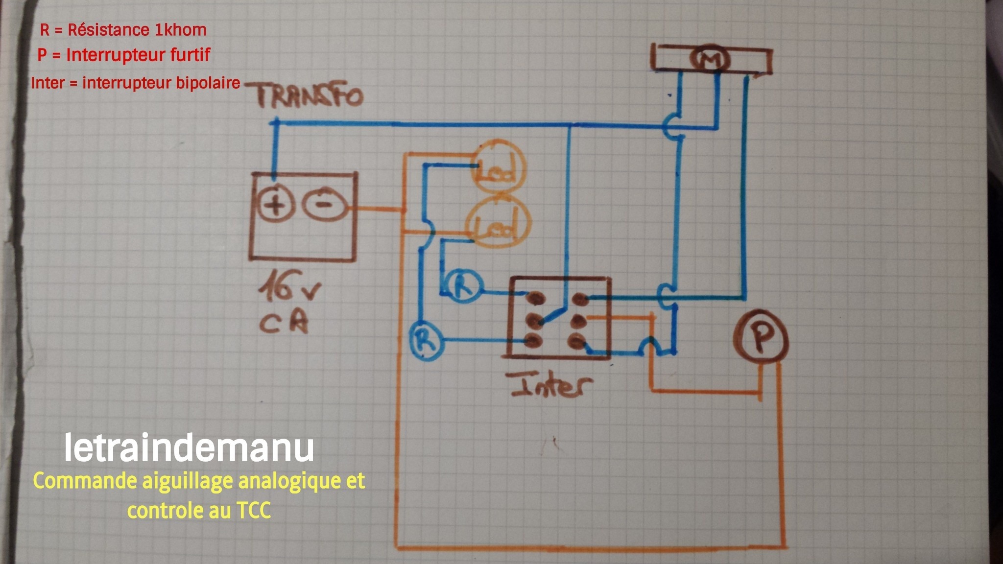 ● alimenter et commander les aiguillages à solénoïde : 14v courant alternatif (AC). Ces câblages seront connectés à la sortie « accessoires » d’un transformateur Fleischmann. Chaque aiguillage doit être commandé par un bouton poussoir associé à un inverseur ( On / On ) multipolaire (plusieurs circuits électriques) pour agir aussi sur la signalisation.