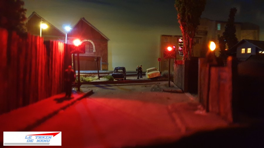 Photo 1787 : Ambiance nocturne sur le réseau Ho dans ZI Nord. La maréchaussée verbalise un Marcillais imprudemment garé sur le passage à niveau. Source : letraindemanu.fr