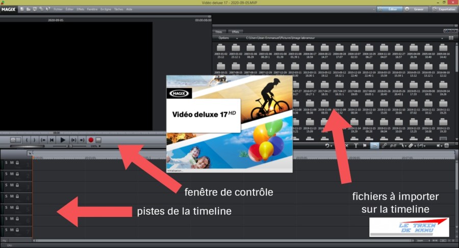 Le logiciel utilisé est une ancienne référence Vidéodeluxe17® de chez Magix®, un logiciel vidéo très complet à un prix abordable. Il existe des versions bien plus récentes chez ce fabriquant. Il faut un peu de temps pour se faire la main sur tous ses outils, mais on y prend vite goût. En plus, ce logiciel sera utile également pour réaliser de jolies vidéos de votre réseau ou d’une exposition. Le logiciel peut accepter jusqu’à 32 pistes audio/vidéo, ce qui est très confortable. En attribuant un type de son par piste, cela facilitera le travail sur les différents jours de la semaine. Il me suffira de copier le fichier original intitulé » bande son lundi » et de retirer ou d’ajouter d’autres sons (par exemple bruit de marché le dimanche au lieu de bruits d’école) sans avoir à tout recomposer. D’autant que sur une bande son de quatre heures, les objets (les pièces de ce puzzle) de quelques dizaines de secondes, seront difficilement visibles à l’écran, sauf à augmenter la visibilité de la timeline en l’étirant. On travaille ici à l’image près, soit 25 images par seconde. J’affiche le compteur de durée qui me facilitera également le travail, en n’oubliant pas que cet afficheur est lui en temps réel (quatre heures).