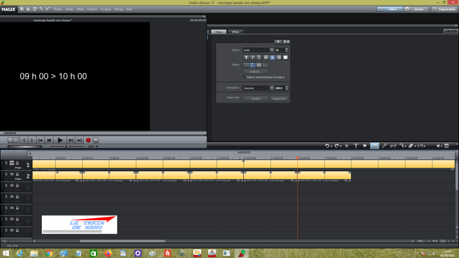 Sur la piste 1, je me confectionne un titre d’une durée de dix minutes exactes. Je démarre de l’horaire minuit > 01 h00. Je démarre de minuit, car ce sera l’heure de début de travail dans le dépôt. Je duplique 23 fois pour obtenir 24 créneaux horaires mis bout à bout et je change chaque intitulé en conséquence. J’obtiens ainsi une bande visuelle de quatre heures m’indiquant chaque créneau horaire de la journée. La piste est ensuite verrouillée pour éviter toute modification indue.