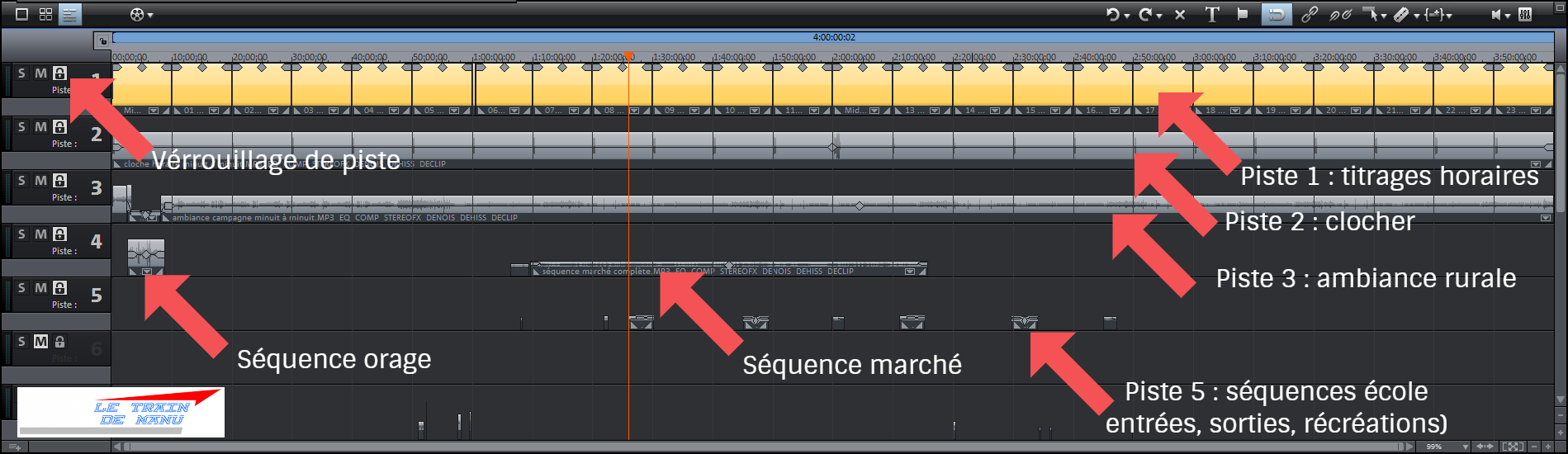 Photo 1803 : La timeline lors du montage de la bande son du réseau. Source : letraindemanu.fr