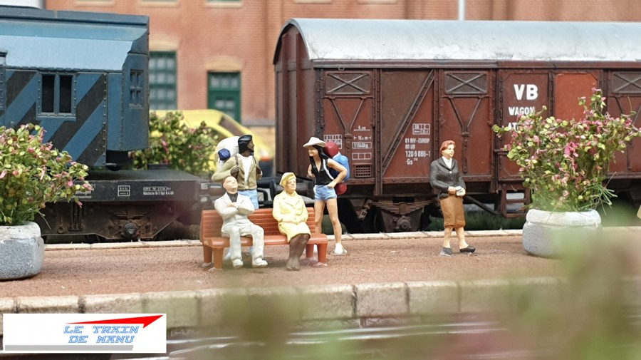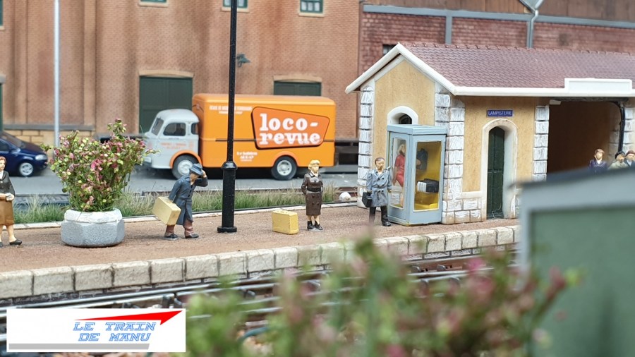 Les personnages offerts par notre ami modéliste sont variés : des ouvriers, des passagers et même un berger avec ses moutons et son chien. Ainsi le quai de ZI Nord est désormais équipé d’une cabine téléphonique et de nouveaux passagers ont pris place sur le quai en l’attente de la navette ouvrière ou du train régional.