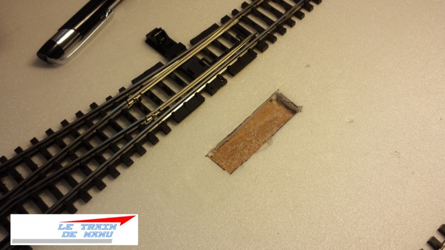 Après avoir tracé sur le Dépron® l’emplacement des futurs éléments de voies, je découpe un rectangle sous l’emplacement des aiguillages. Cette fosse s’étend entre les deux rails de roulement, entre la pointe et le cœur (pour les aiguilles élancés à pointe de cœur mobile, la fosse doit être allongée au delà du cœur). Cette opération vise à obtenir un espace entre le mécanisme et le support. Ainsi aucun gravier ne risque de s’y coincer. Pour des raisons esthétiques, cette fosse est ensuite peinte en noir mat ce qui la rend moins visible au final. On laisse sécher une journée, surtout avec la peinture type Humbrol.