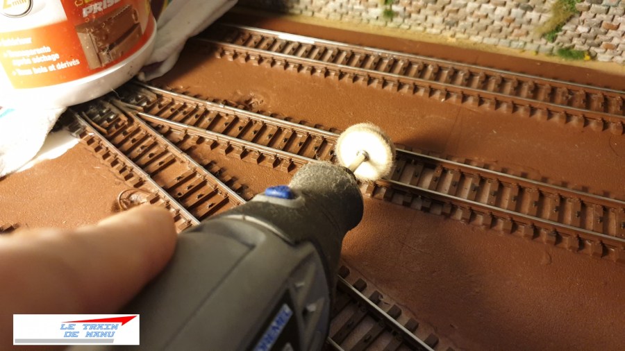 L’ensemble des voie est ensuite peint avec une peinture acrylique en bombe de gamme modélisme, à défaut de posséder un aérographe pas très pratique en appartement. J’ai utilisé un marron cacao de la gamme « Do it ! » de Marabu achetée chez Truffaut. Par la même occasion, on peint les flancs extérieurs de rails. Je laisse sécher une journée. Après séchage, je nettoie les dessus de rails de roulement, leur flanc intérieur et les picots avec un chiffon imbibé d’alcool à 70°. Je répète l’opération avec un disque de polissage en feutre monté sur la Drémel.