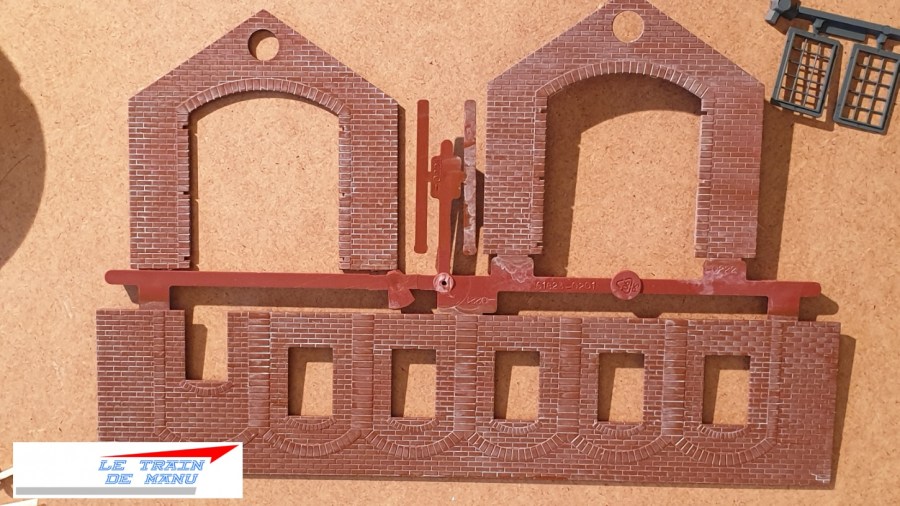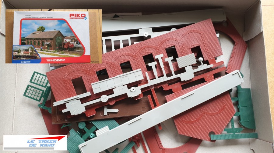 Cette maquette en plastique proposée par Piko sous la référence 61823 est une remise en briques et portes en bois d’époque II. Ce bâtiment mesure L 247 x l 119 x H 105 mm. Ce type de remise n’était au départ absolument pas prévu, mais ses dimensions et son implantation sur la longue voie de remisage s’avèrent finalement idéales pour masquer le départ vers le futur module 4 Sud-Est.