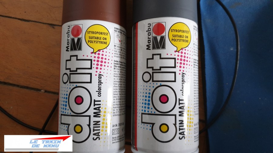 Les portes sont travaillées à la peinture acrylique en bombe teinte Kakao (161) de la gamme » Do it ! » de chez Marabu (achetée chez Truffaut également). Ces bombes sont pratiques quand on n’a pas d’aérographe. La maquette étant prévue pour une ou deux sorties, il y a donc quatre portes, à peindre recto-verso. Sur les mêmes grappes sont situées les pièces de rehaussement de toiture en bois et les soutiens des auvents métalliques de porte piéton.