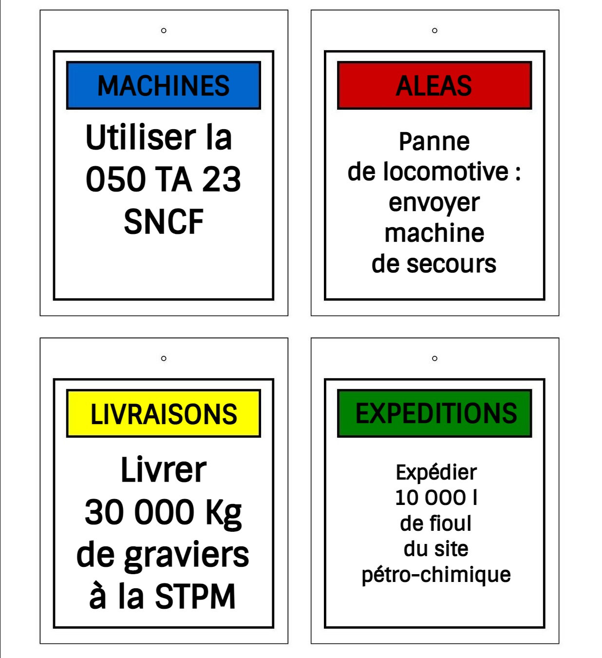 ■ Des cartes « Expéditions » : Objectif, récupérer des wagons vides chez les clients pour les ramener au triage fictif de Sainte-Gisèle-les-Bourges : Comme ces wagons ne sont par définition pas connus à l’avance en fonction des livraisons précédentes, la carte pourrait alors être ainsi rédigée » récupérer les wagons vides chez Laure Noirt « . Il peut s’agir aussi d’expédier des chargements à partir de clients. Par exemple : « Expédier 150 tonnes de charbon des Houillères de France ». Dans ce cas, il faudra donc calculer et expédier les wagons nécessaires.