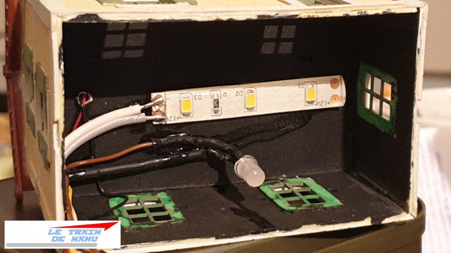 Une led blanc chaud de 5 mm est installée au 1er étage, dans la pièce côté dépôt. La led est collée à la colle cyanoacrylate Colle21. Elle est équipée d’une résistance de 4,7 KOhms. Pour le rez-de-chaussée, j’ai installé une barrette pré câblée de trois leds blanc chaud. Cette barrette dispose de sa propre résistance. Enfin, une led TV 5 mm a été implantée au rez-de-chaussée. Branchée avec une résistance de 1 KOhm elle ne clignote pas autant que souhaité : j’aurais du préférer la 560 Ohms fournie avec. Rien de dramatique toutefois. Tous ces éclairages intérieurs sont connectés sur un même branchement relié aux autres éclairages intérieurs du dépôt.