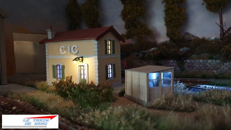 Une applique extérieure a été installée au-dessus de la porte d’entrée. J’ai repris la même technique que celle déjà utilisée pour les studios de cinéma et le bâtiment du chef de dépôt. Cet luminaire est branché sur le circuit » éclairages extérieurs » du dépôt.