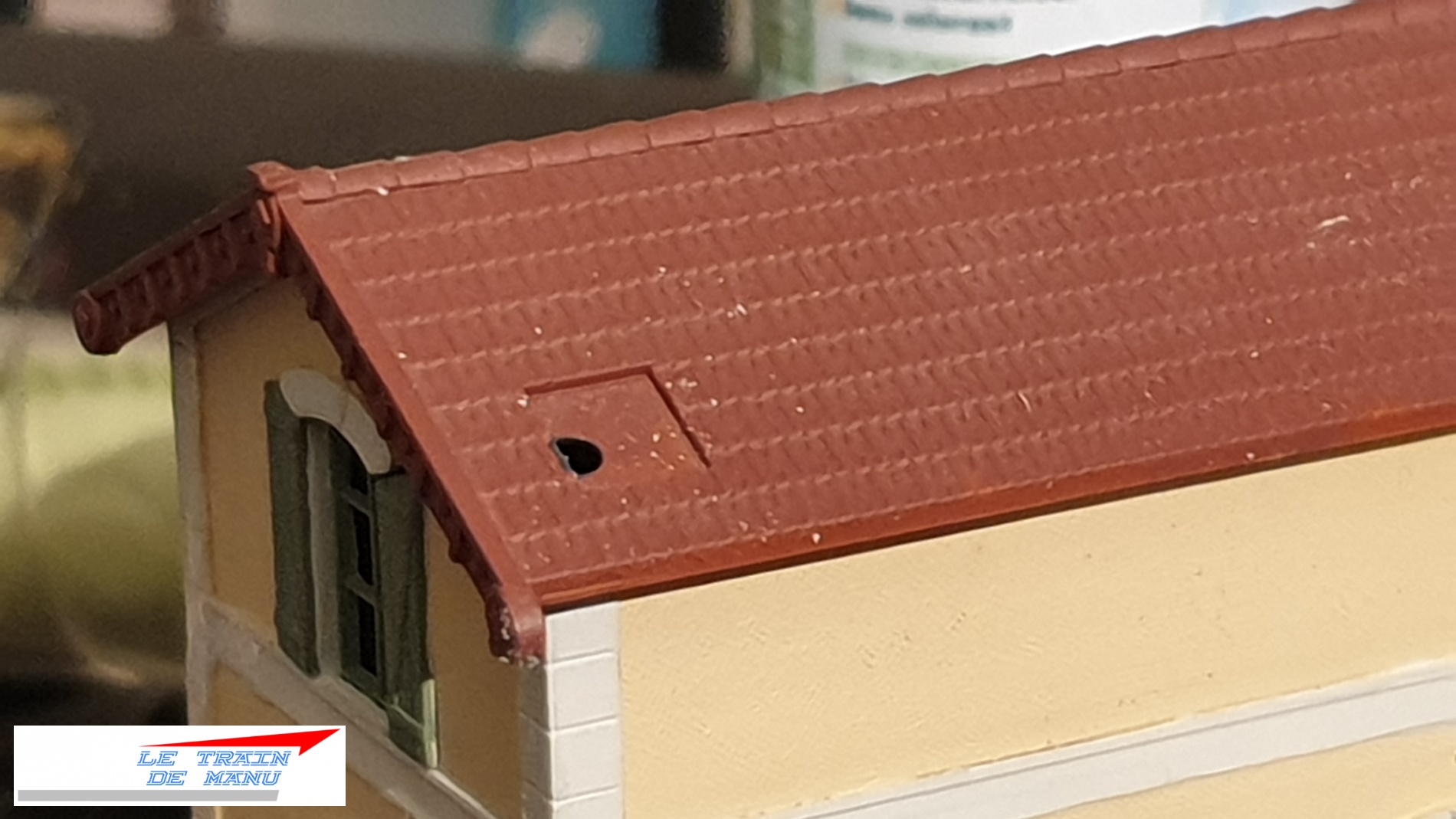 La maquette n’ayant pas de cheminée, j’en ai récupéré une dans la boite à rabiots. Peinture en gris béton et mitron en ocre rouge. Base poncée pour obtenir le bon angle de pente puis collage à la colle cyanoacrylate Colle21 sur un carré de feuille métallique. Le tout est ensuite collé sur le toit.
