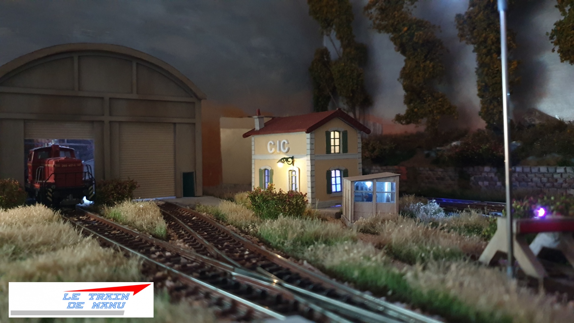 Une applique extérieure a été installée au-dessus de la porte d’entrée. J’ai repris la même technique que celle déjà utilisée pour les studios de cinéma et le bâtiment du chef de dépôt. Cet luminaire est branché sur le circuit » éclairages extérieurs » du dépôt.
