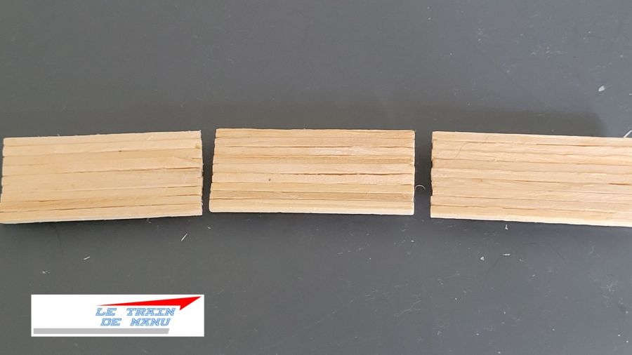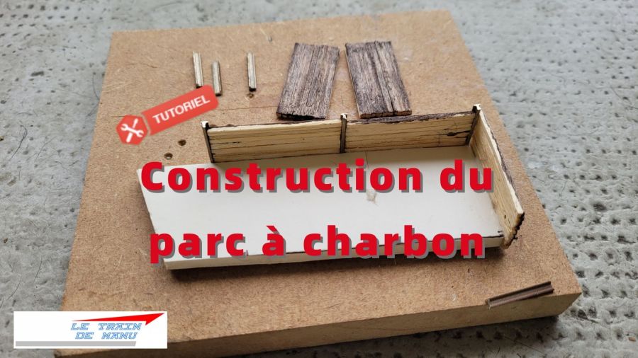 On colle ensuite les panneaux de bois sur les rails, la face supérieure du rail étant à l’intérieur du parc à charbon. On obtient trois faces : une face avec trois panneaux, une face (extrémité) avec un panneau, une face avec deux panneaux. Le collage entre bois et rails se fait à la colle cyanoacrylate Colle21. On colle le tout autour du socle en carton.