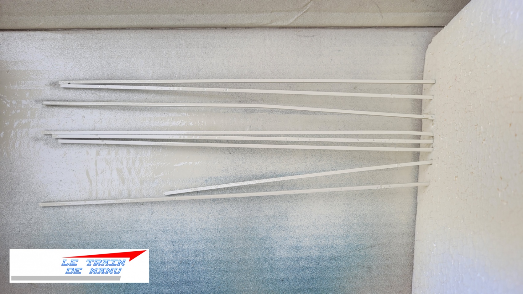 Dans une cagette en carton, on dispose plusieurs vieux rails maintenus à une extrémité dans du polystyrène pour que la face du dessous se retrouve au dessus. Avec une bombe de peinture acrylique teinte ivoire, on peint les rails. Cette couche me sert d’apprêt. Puis, une fois sec, je passe une couche de peinture teinte cacao. Nous n’avons besoin en fait que d’un seul rail pour nos travaux, le reste servira donc d’éléments pour un décor ultérieur. On laisse sécher.