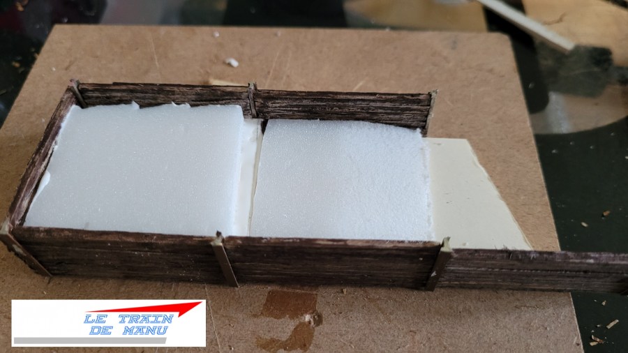 Dans du Carton-Plume de 5 mm on découpe un socle de largeur 36 x longueur 135 mm, soit les dimensions intérieures du parc. On découpe un second morceau de 36 x 80 mm que l’on colle sur le premier à la colle vinylique. Avec du papier de verre, on crée une pente à l’extrémité la plus basse. Ce socle a deux fonctions : la première est de donner du volume au chargement, la seconde de renforcer le collage des parois.