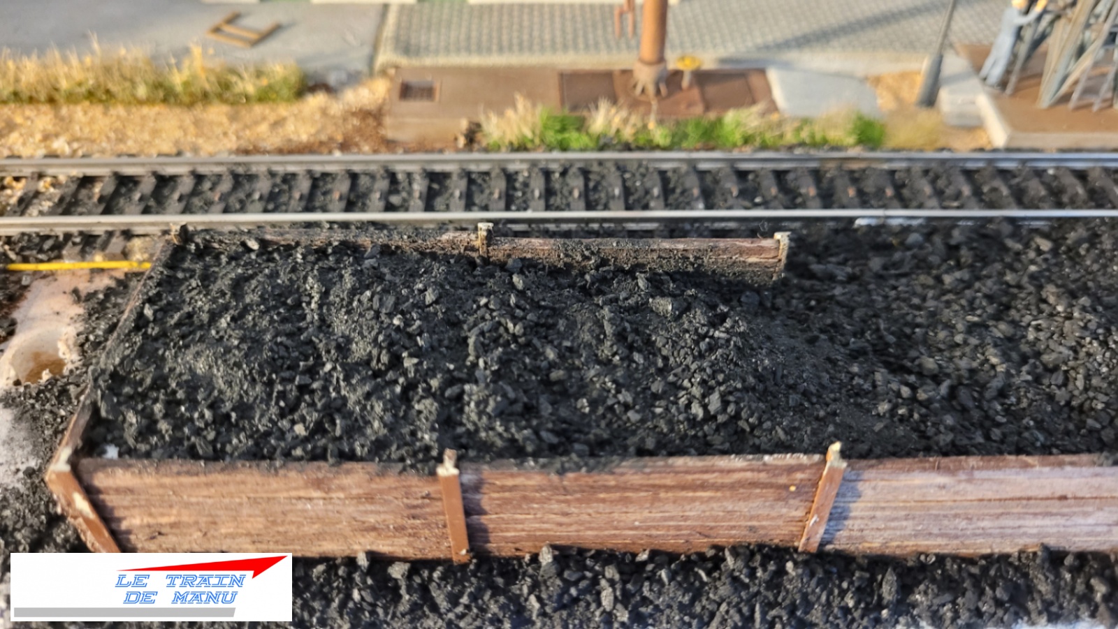 J’utilise du charbon de bois. Il est pilé avec un marteau jusqu’à obtention de petits grains et de poudre. Sur le socle peint et sec ainsi que sur le sol et le parc Kibri de récupération (on n’oublie pas les extérieurs des parcs), je dépose au pinceau un lit de colle vinylique au pinceau. Le charbon pilé y est ensuite déposé. Le tout est humidifié au brumisateur puis encollé avec de la colle vinylique diluée comme pour le ballast. Si besoin on répète l’opération.