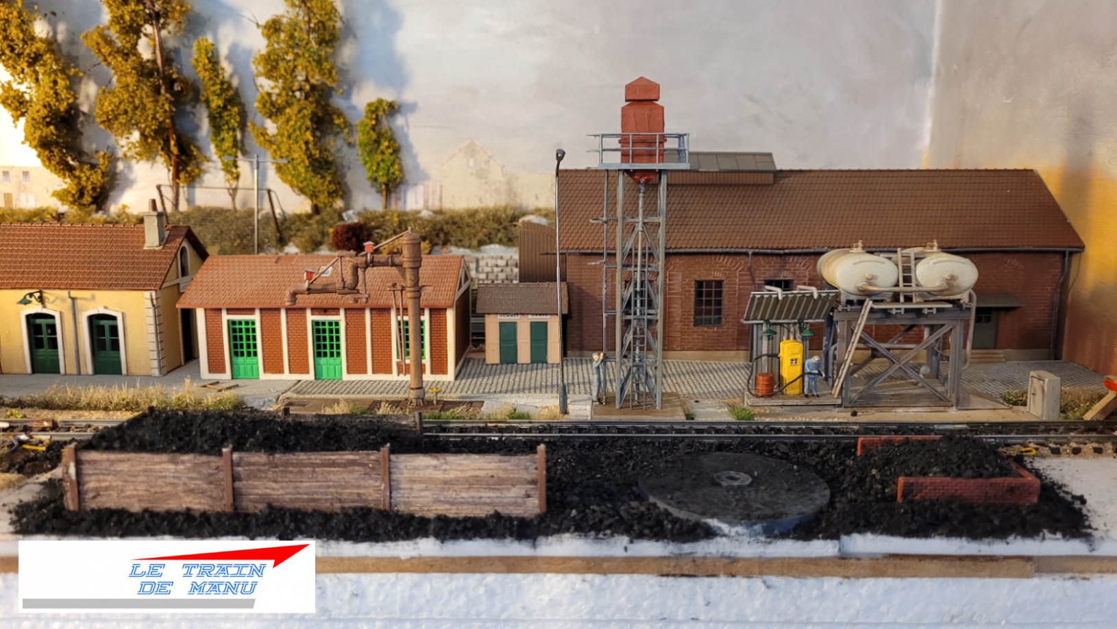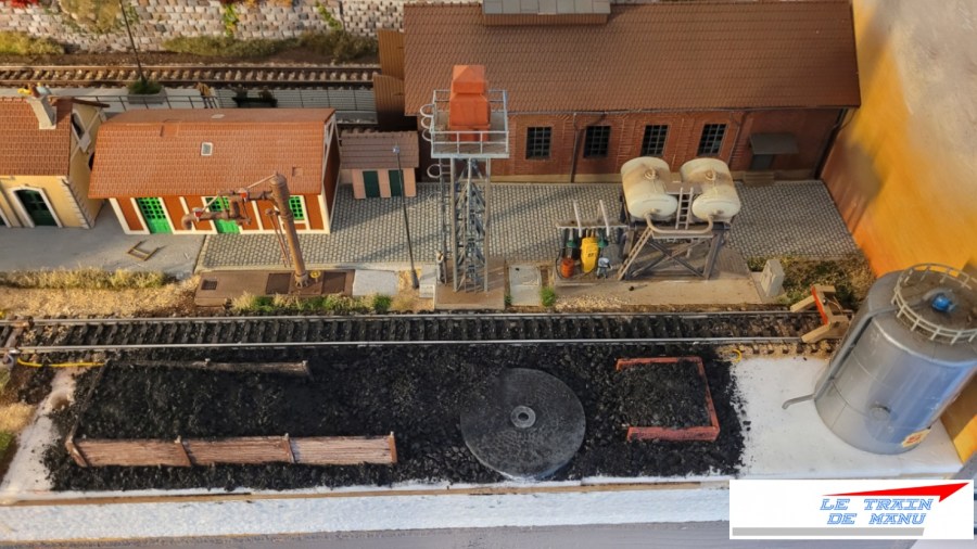 Le dessus du socle est peint en noir mat. Le parc est ensuite collé à son emplacement définitif. J’ajoute à proximité le socle d’une vieille grue Jouef (qui sera traitée ensuite) puis un reste de maquette plastique Kibri issu d’un vieux parc à charbon en briques.