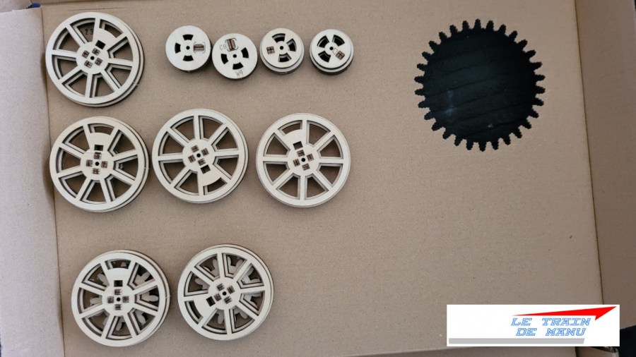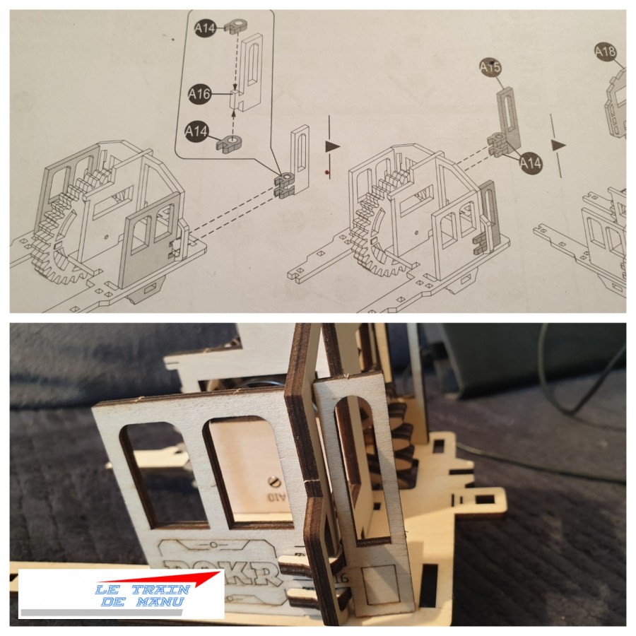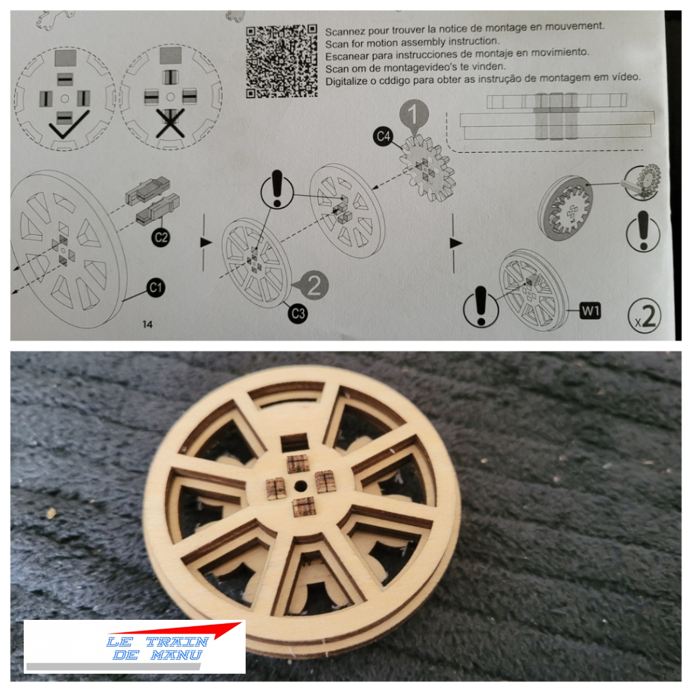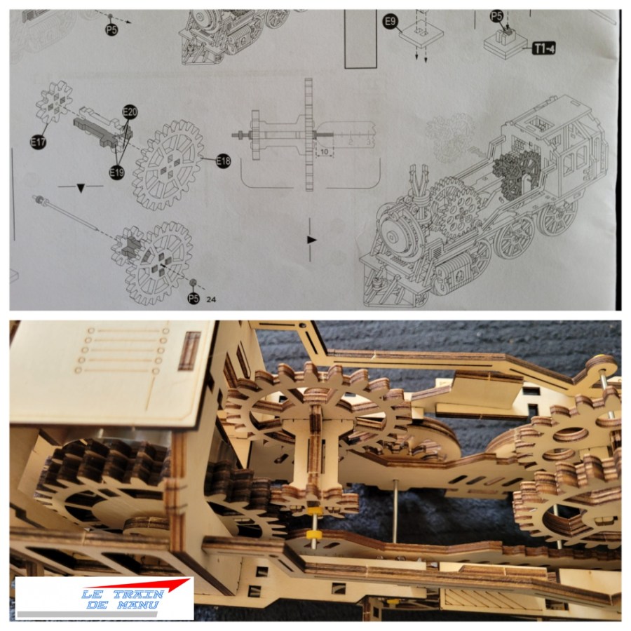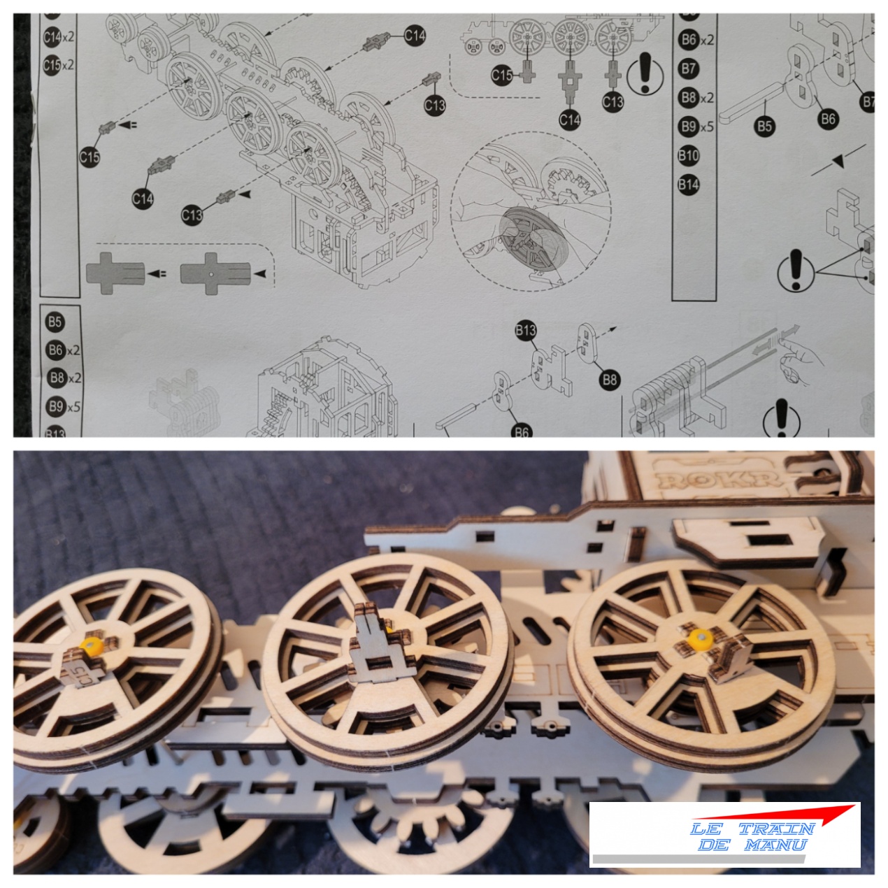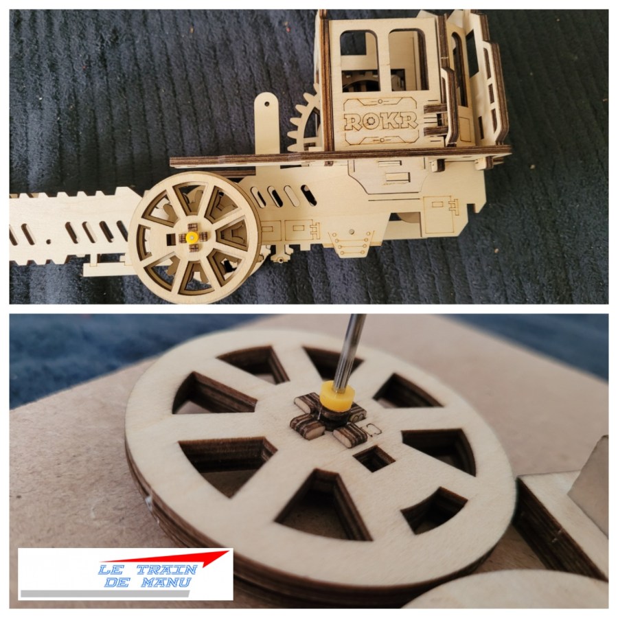 Photos 2115 et 2116 : Montage des engrenages d’entrainement sur la locomotive en bois de Nature et Découvertes. Source : letraindemanu.fr
