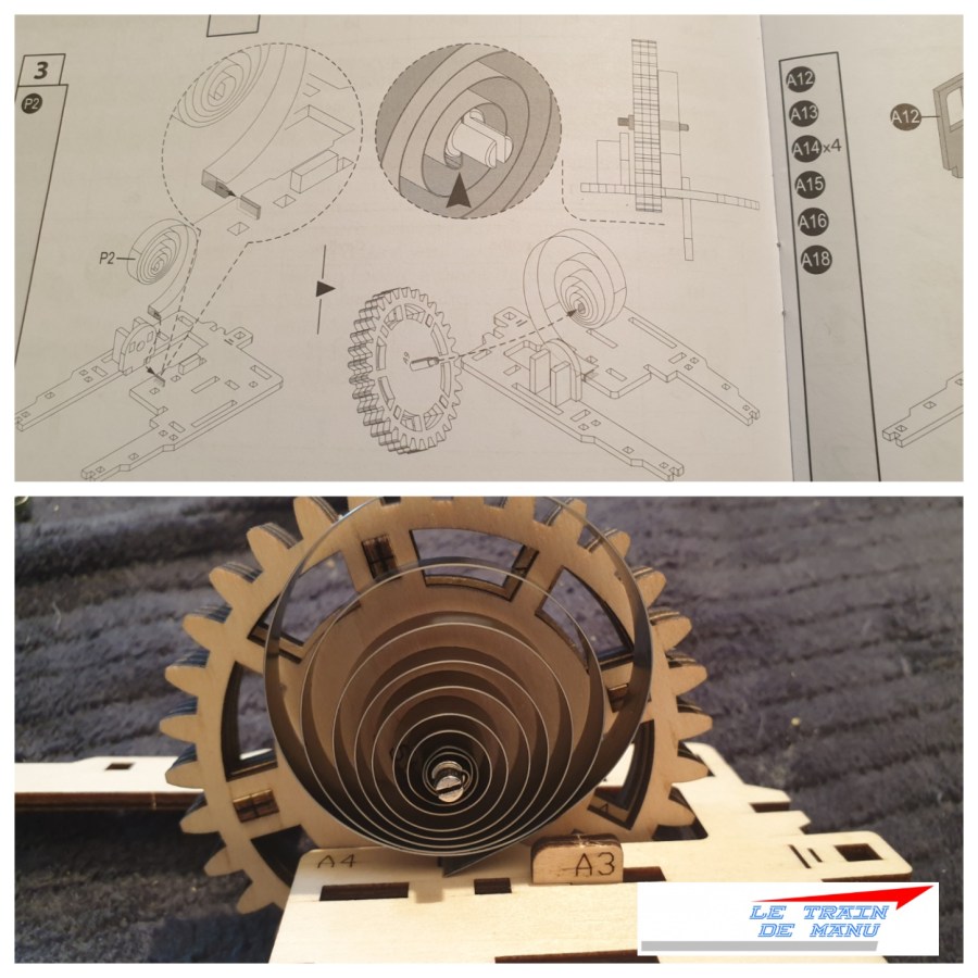 A partir de l’étape 2, on commence à monter les engrenages, notamment l’engrenage d’entrainement. Il faut bien respecter le sens de montage, car même si la maquette n’est pas collée mais simplement emboitée, il sera très compliqué de revenir en arrière en cas d’erreur..
