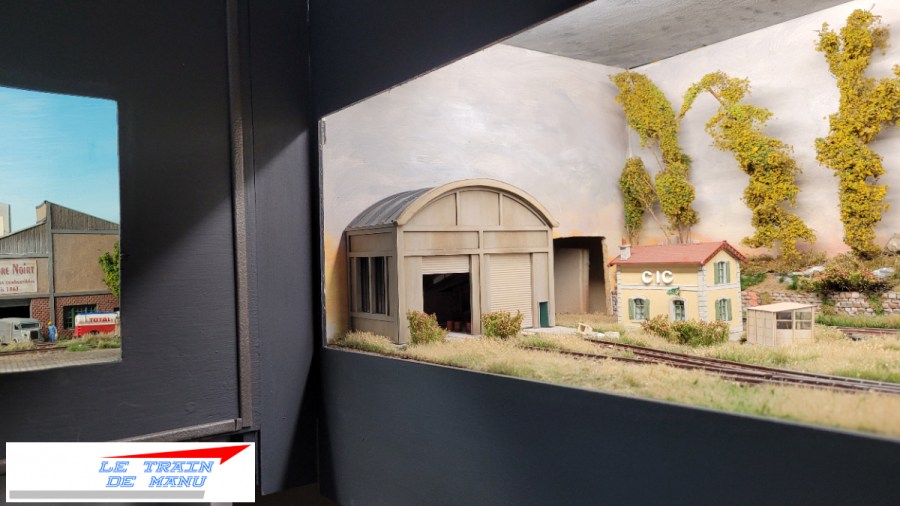 Le résultat est esthétique. Il me faudra trouver les lettrages pour titrer le module « ZI Est – Le dépôt » en couleur gris pierre pour rappeler le titrage de ZI Nord. Il me reste encore à installer le Polyglass 4 mm, mais c’est un produit assez onéreux  : de mémoire, 45 € la plaque. Cette dernière étant vendue par section de 1 x 05 m, il m’en faudra deux. Une plaque sera montée sur charnière au centre, les 16 centimètres de chaque côté seront fixes. Comme sur Z.I. Nord, un joint d’étanchéité en mousse sera collé en périmètre de façade. Cet investissement s’avère nécessaire pour protéger le décor de la poussière urbaine et accessoirement au pelage abondant de Blacky.