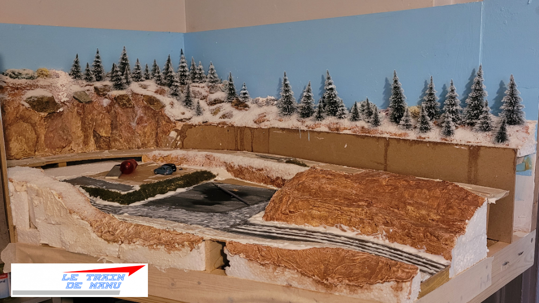 Module d’angle visible. Thème : Village de montagne en hiver. En cours de finition.