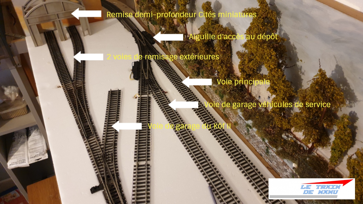 ● Permutations aiguilles : Manuelle à pied d’œuvre sur les deux aiguilles de remisage et motorisation des trois autres aiguilles (moteur Märklin 7549).