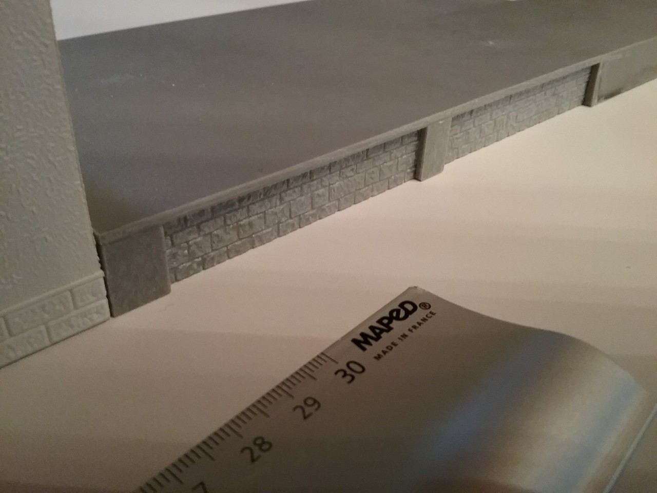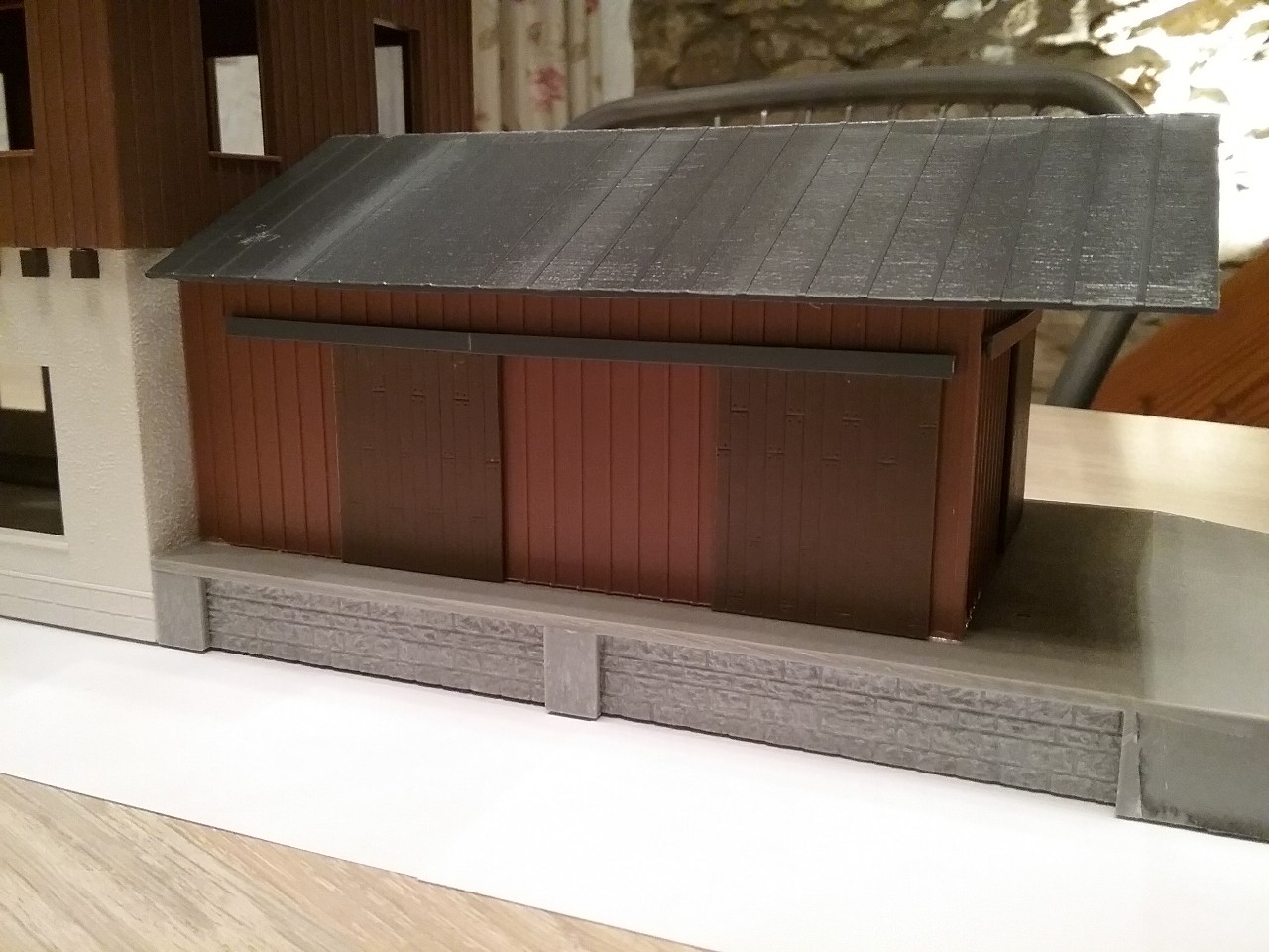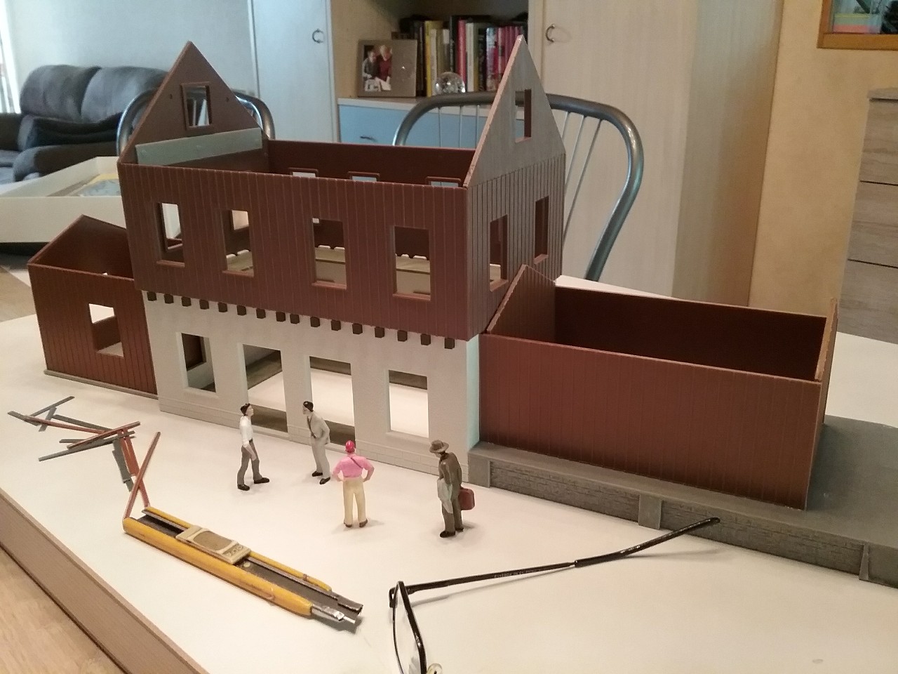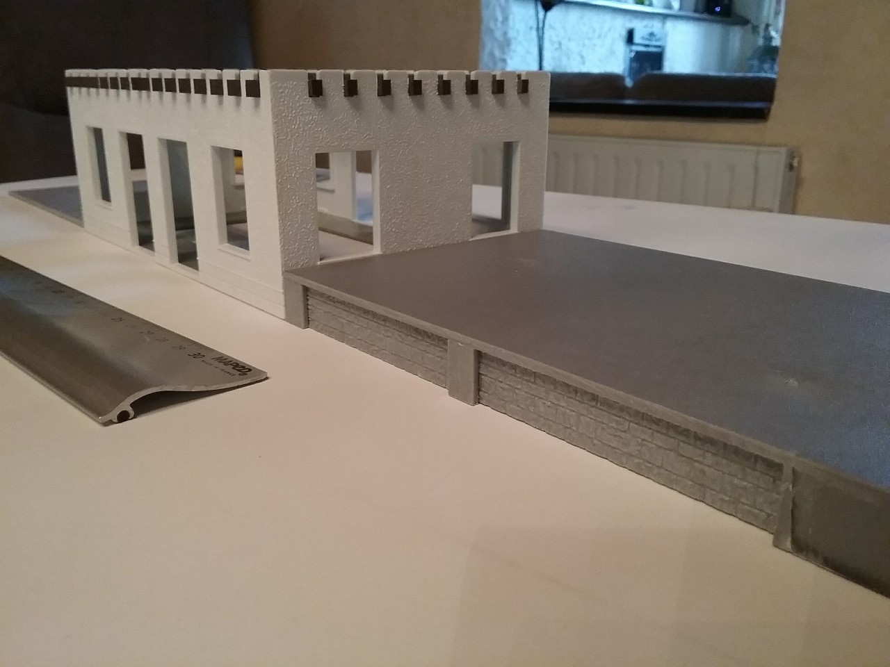 J’attaque par l’assemblage du rez-de-chaussée du bâtiment voyageurs, la découpe du socle de la petite annexe gauche et la réalisation du quai avec sa rampe pour la petite halle de droite.