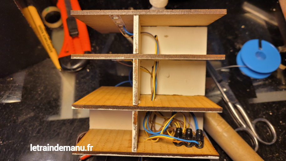 Les sections de ruban sont coupées puis câblées. Ayant deux groupes d’éclairage, un groupe est câblé en bleu, l’autre en jaune. La masse en marron est commune à tous les groupes. Les rubans ont des autocollants 3M au dos, mais je préfère ajouter quelque gouttes de cyanoacrylate Colle21. Les fils sont passés dans les cloisons par des trous forés à la Dremel.