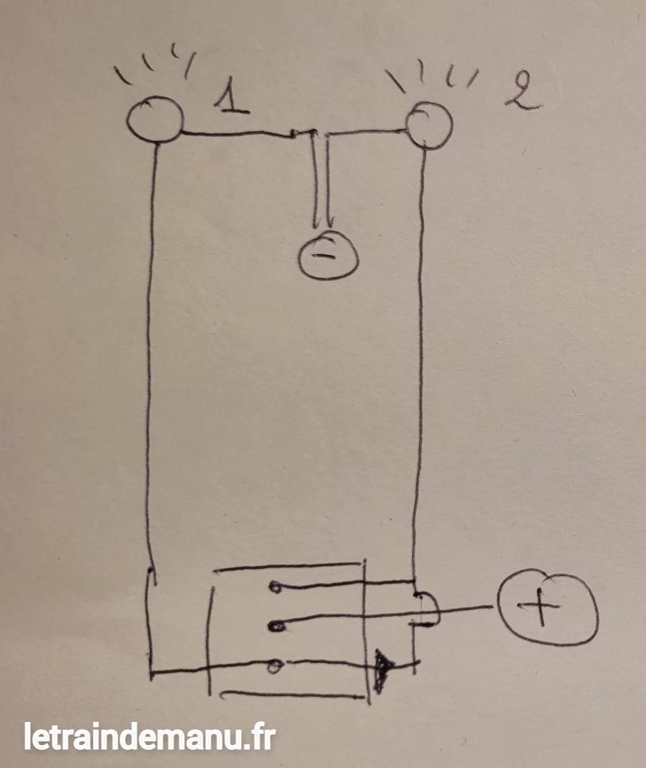L’inverseur utilisé est un inverseur ON/OFF/ON bipolaire (un monopolaire suffit). Cet inverseur à position central off me permet donc d’obtenir soit le chalet éteint, soit tous les éclairages allumés, soit le seul groupe 1 allumé. Un plan valant mieux qu’un long discours :